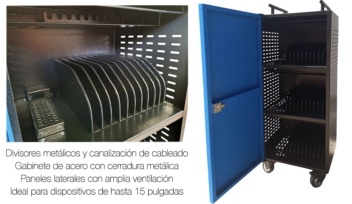 Cuenta con una cerradura metálica para un mejor resguardo de los dispositivos. Los paneles laterales cuentan con una amplia ventilación para evitar el sobrecalentamiento de los dispositivos mientras cargan, las divisiones de los dispositivos son de acero y están recubiertos para evitar desgaste de los equipos, proporciona también organización de dispositivos y cableado de los mismos.